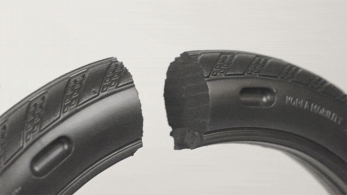 Wide, tubeless tires were selected for high resistance to tire punctures. These solid tires are also much lighter compared to the competition.